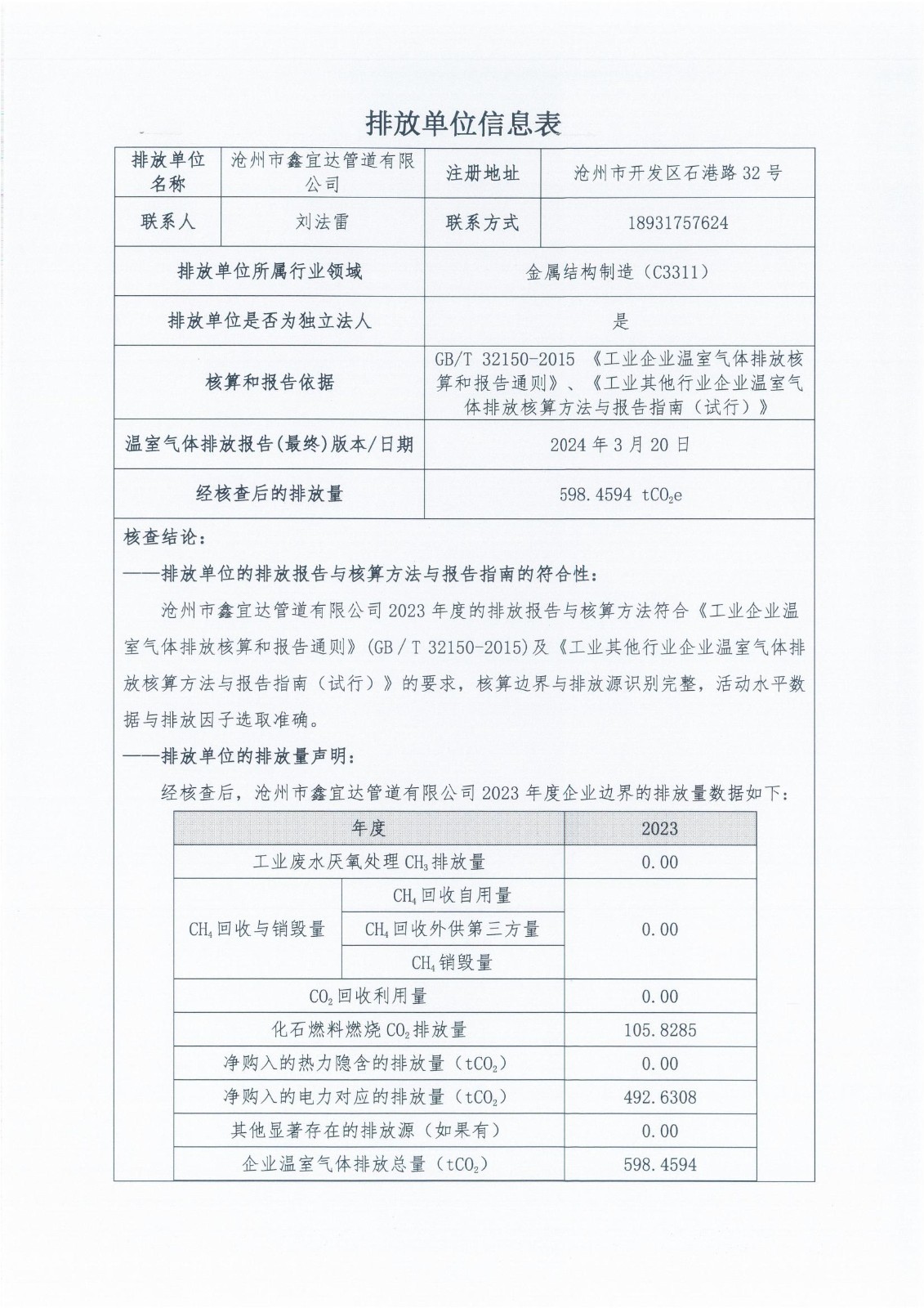 滄州市鑫宜達(dá)管道有限公司2023年度溫室氣體排放核查報告